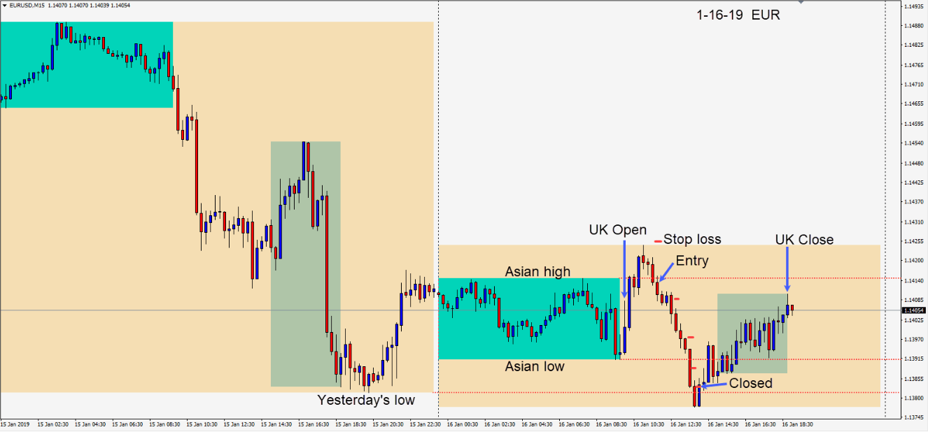 The EURUSD was more appealing with a risk of 13 pips for a potential 75 pips to our daily target at 1.1338. An entry short was taken, price moved down to yesterday’s low where it began to retrace in advance of the U.S. open closing our trade for modest gains well short of our target.