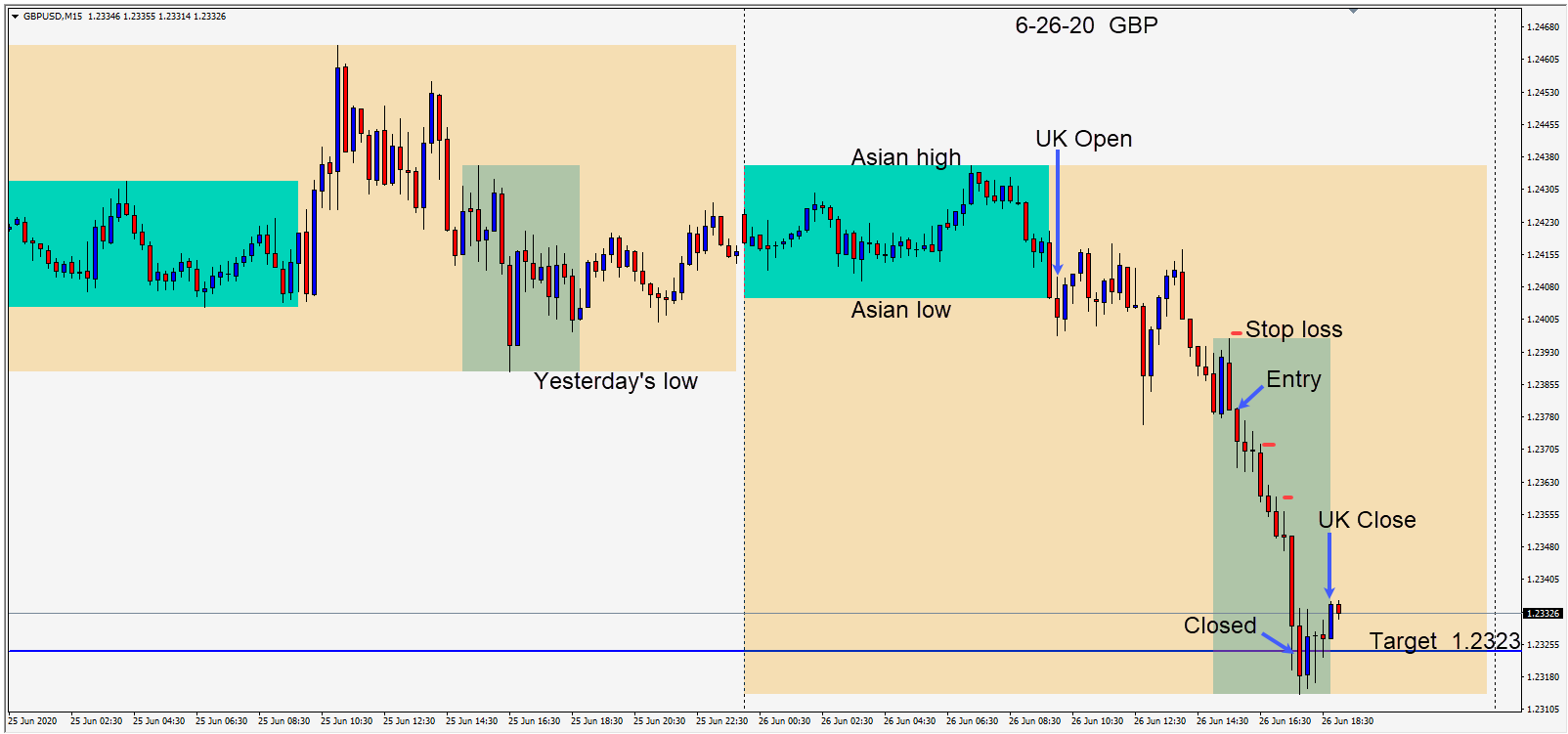 Today however the trading was very worthwhile. A GBPUSD short was taken early in the U.S. session overlap, risking 18 pips for a potential 55 pips to our daily target at 1.2323.