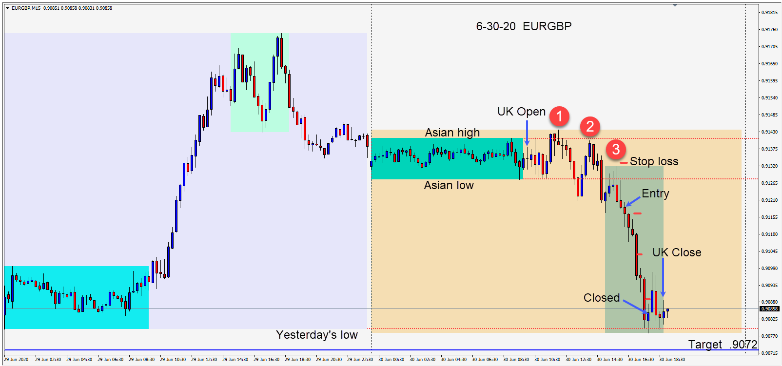 A short was taken after the pair made a third lower high in the session requiring a 15 pip stop loss for a potential 46 pips to our daily target at .9072. As price moved lower we removed the risk from the trade by moving our stop loss to a profitable position.