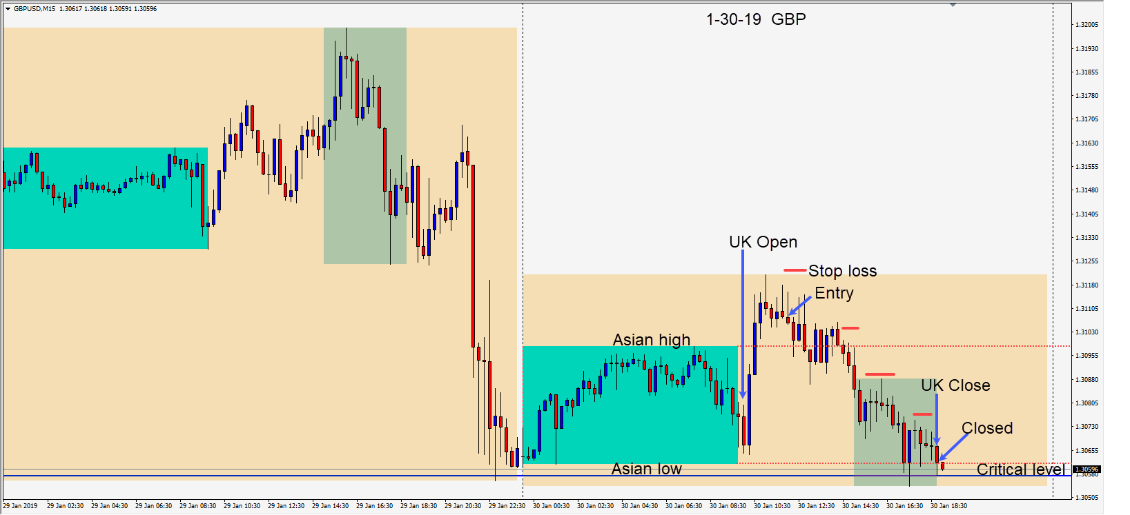 As the U.K. session got underway the GBPUSD climbed above its Asian high and stalled. Sellers entered and began pushing price down as evidenced by the long upper wicks and lower highs forming. A short was taken and the critical level today to get through was around 1.3060. If this level gives way, price may retest it but if sellers enter again, I expect 1.3000 to be targeted and a potential move down to test the 1.2900 level.