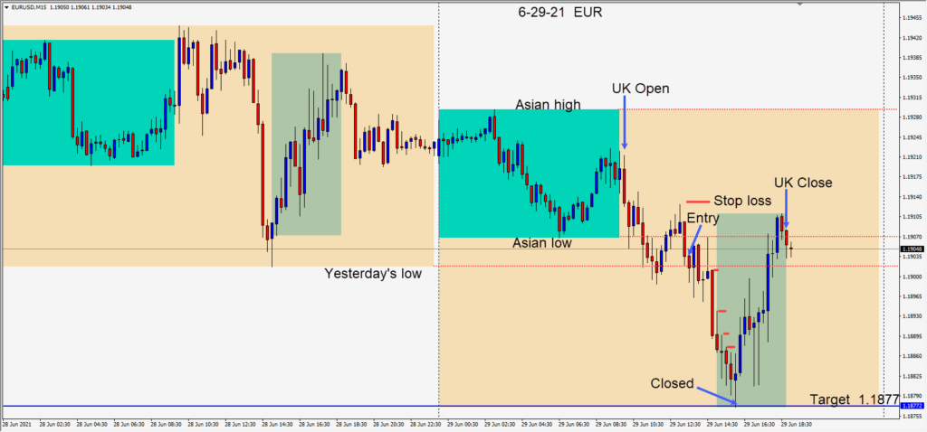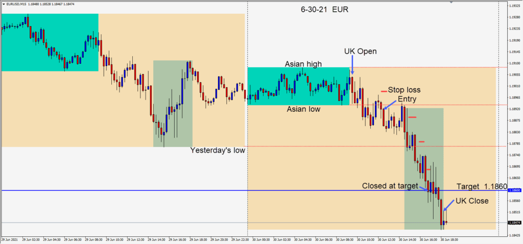 This trade was very similar to yesterday’s trade. Price moved lower early in the U.K. session luring in breakout traders. We waited for it to pull back and move lower again before going short… risking 8 pips for a potential 31 pips to our daily target at 1.1860....