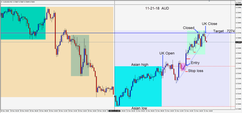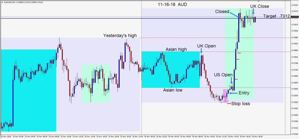 The AUDUSD set up for a long today with a slightly softer USD and gold moving up. Risking 6 pips for a potential 32 pips to our daily target at .7274 we entered long after a “W” pattern reversal and bounce off a simple trendline. Price moved up in advance of the...