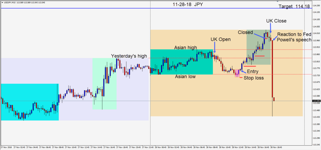 Today as the USDJPY moved down it found buyers at its Asian session low and a reversal setup gave us an entry risking 6 pips for a potential 42 pips to our daily target at 114.18. Price moved up very little in advance of the U.S. Open and we moved our stop loss up...