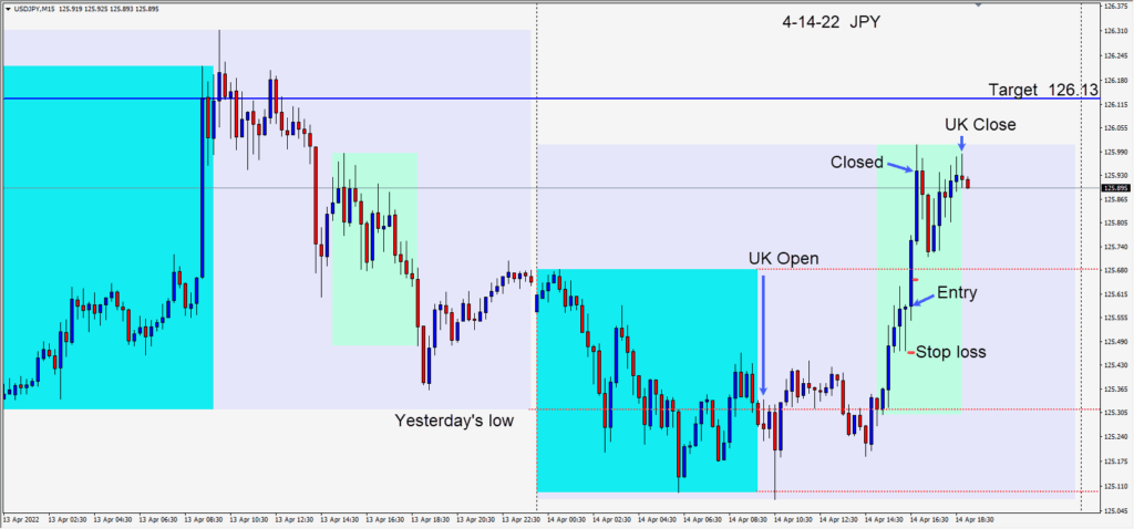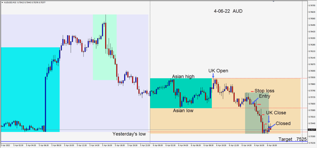 The AUDUSD set up for a short early in the U.S. session overlap after a third lower high… risking 15 pips for a potential 39 pips to our daily target at .7525. Price went sideways after the entry for 30 minutes then began to move lower stalling near...