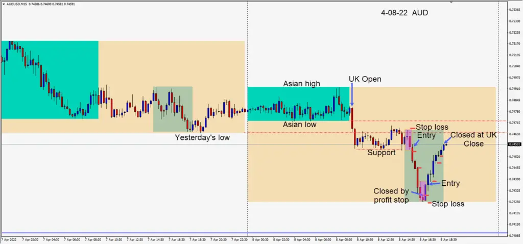 The AUDUSD traded mostly sideways going into the U.S. session overlap. A short set was taken risking 11 pips for a potential 48 pips to our daily target at .7409. Price moved lower and we locked in profits as it did. A reversal pattern set up and we re-entered long...
