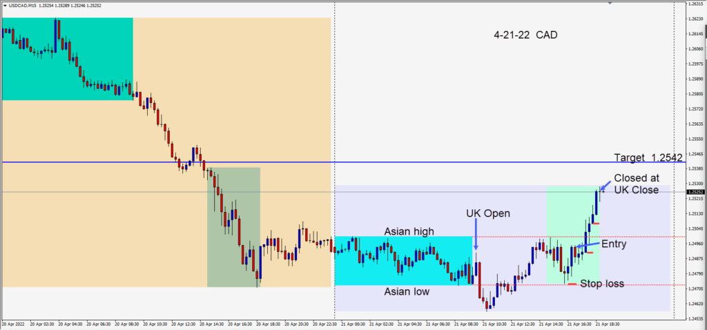 The USDCAD started the U.S. session dipping down to test its Asian session low… very close to yesterday’s low and found buyers. As the pair began to climb higher, a long was taken risking 20 pips for a potential 49 pips to our daily target at 1.2542. The pair moved...