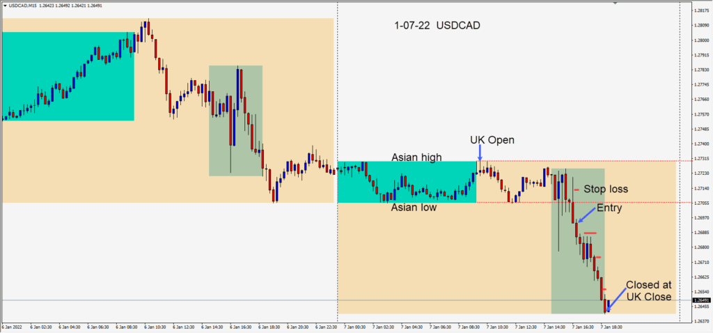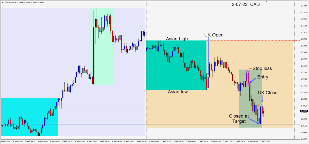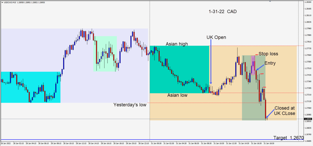 A quiet Monday with little economic news to drive price. The USDCAD made a brief move higher as North American traders began their day. Price then reversed lower following a bearish engulfing candle. A short was taken risking 14 pips for a potential 40 pips to our...