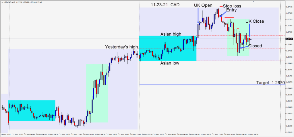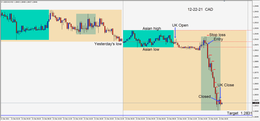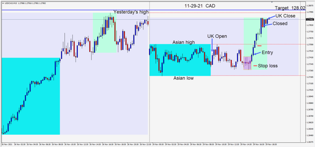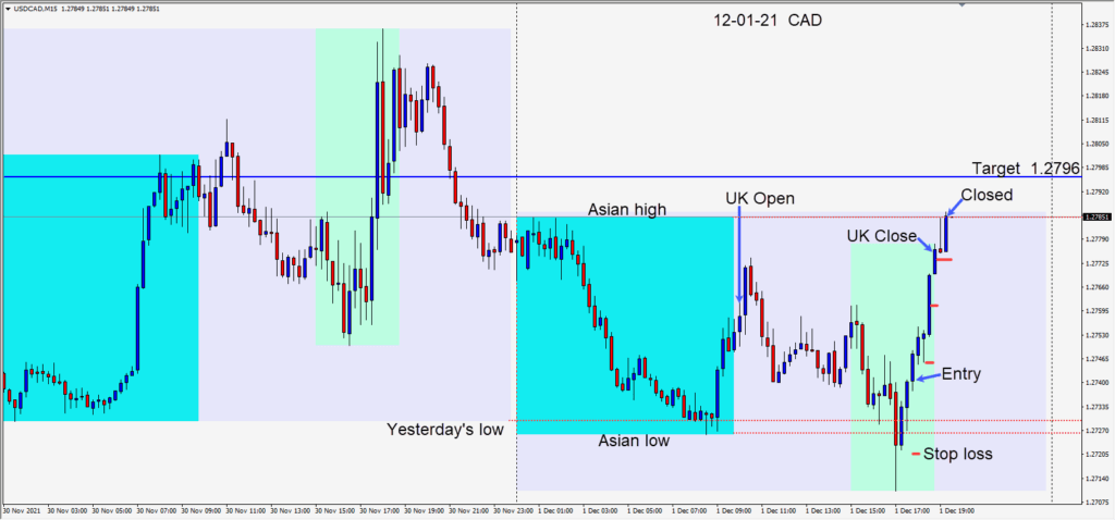 The USDCAD began the U.S. session ranging sideways without testing its Asian session low. When the pair broke above this range, a long was taken, risking 15 pips for a potential 55 pips to our daily target at 1.2802. The first area to clear was the Asian session...