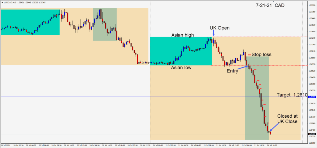 The USDCAD started the U.K. session moving down to test its Asian session low before moving higher to test the 1.2700 figure. As the U.S. session got underway, price moved lower with momentum and a short was taken risking 22 pips for a potential 62 pips to our...
