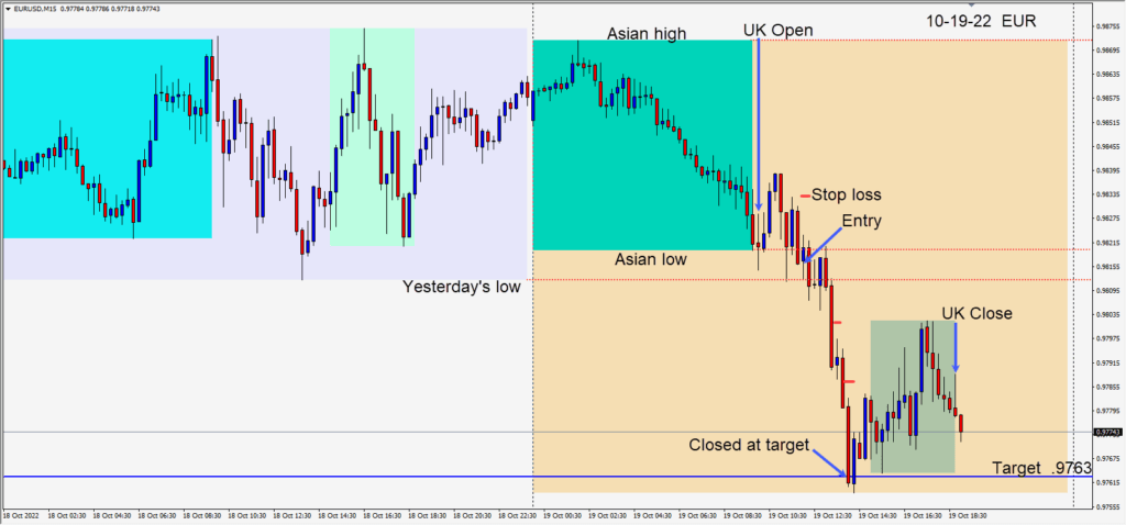 The Asian session saw the EURUSD move lower and as the U.K. traders began their day, breakout shorts were tricked, and the pair briefly moved higher taking out stops. A second test of the Asian low found some buyers for one candle which was followed by a bearish engulfing candle and a close beneath the Asian session lows. A short was taken risking 18 pips for a potential 53 pips to our daily target at .9763.