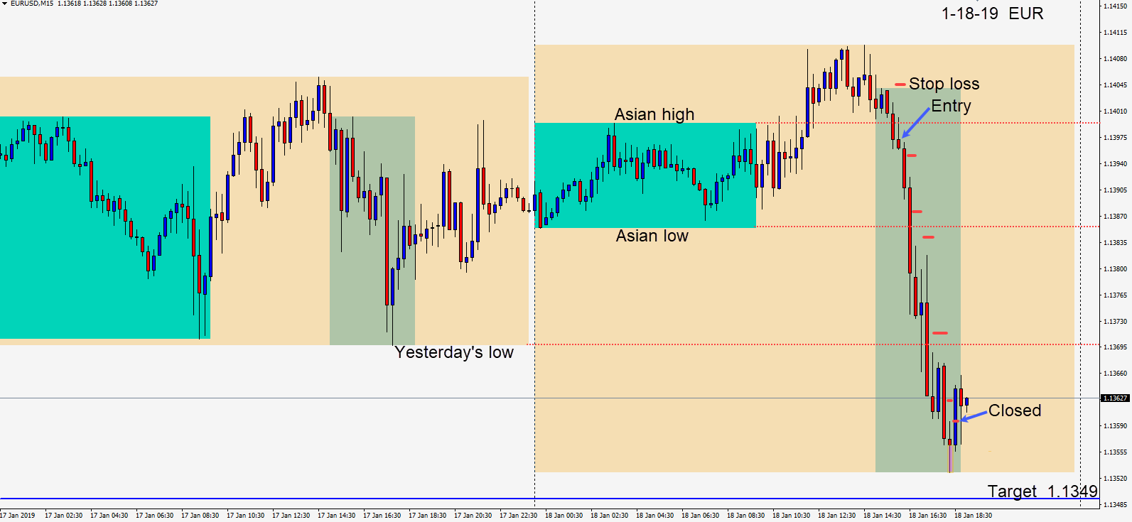 As the U.S. session got underway, the EURUSD broke lower and a short was taken risking 8 pips for a potential 48 pips to our daily target at 1.1349. Price moved down through its Asian session low but had difficulty getting through yesterday’s low. It began to reverse mid-figure leaving a long lower wick candle. We moved our profit stop just above the candle’s high and the next next candle closed the trade.