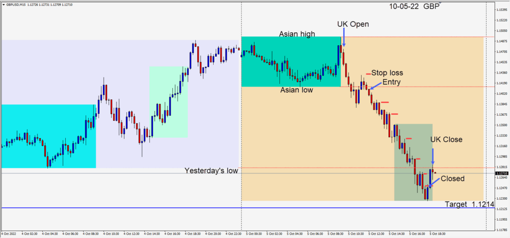The GBPUSD was unable to close above yesterday’s high during its Asian session and the U.K. traders began their day pushing price lower. After a very brief pullback testing its Asian session low, the pair failed and a short was taken risking 28 pips for a potential 194 pips to our daily target at 1.1214.