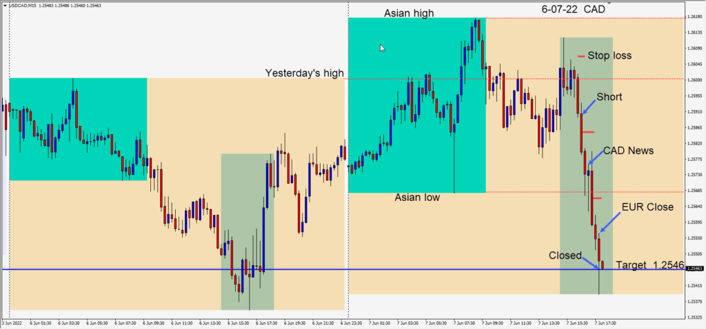 Price continued lower and we moved our profit stop lower, taking the risk out the trade in advance of the CAD economic news release. Price tested its Asian session low for two candles before breaking decidedly lower. The trade was closed at our target just before the European close. The last fifteen minutes going into the European close can be quite volatile as traders take profits.