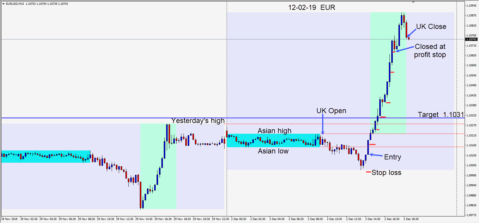 With the weaker USD versus the majors, a long was taken in the EURUSD risking 10 pips for a potential 20 pips to our daily target at 1.1031. It didn’t take long for the pair to rise through our target level and we were able to stay in the trade moving our profit stop up as the USD sank further.