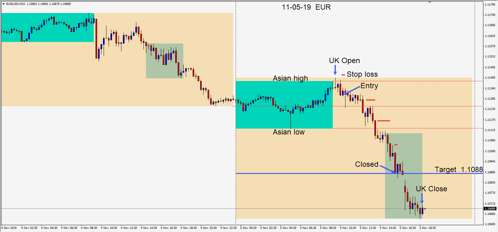 Today as the the EURUSD failed to close above its Asian session high, a short was taken risking 11 pips for a potential 41 pips to our daily target at 1.1088. Price moved down to its Asian session low and retested this level as the U.S. session was about to get underway. Price then continued downward and we exited at our target level of 1.1088.