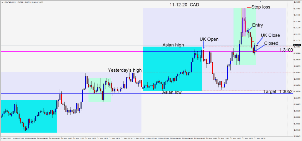 After rising for most of the session the USDCAD formed a 3 candle reversal pattern and a short was taken risking 20 pips for a potential 70 pips to our daily target at 1.3052. Price moved lower but failed to remain below the 1.3100 figure and the trade was closed.