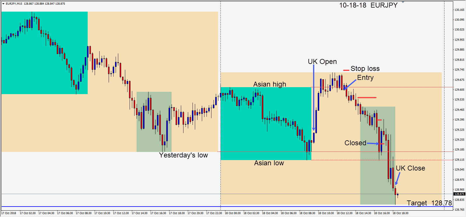 Today the EURJPY spent some time stay above its Asian high but ultimately failed and an entry was taken risking 14 pips for a potential 82 pips to our daily target at 128.78. Price slowly moved down in advance of the U.S. open and we protected ourselves by moving our stop loss to a profit stop. Price continued down to test yesterday’s low and its Asian session low before bouncing above yesterday’s low where we exited the trade.